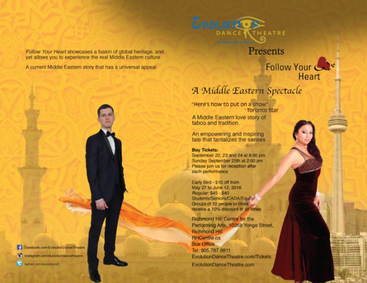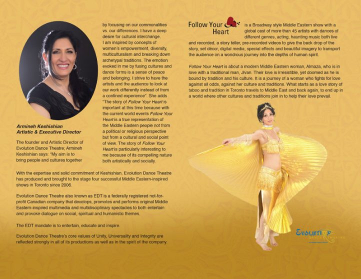 Follow Your Heart is a Broadway style Middle Eastern show. With global artists and dances of different genres, acting, haunting music both live and recorded, a storyteller, pre-recorded videos to give the backdrop of the story, set décor, digital media, special effects, and beautiful imagery transports the audience on a wondrous journey into the depths of human spirit.